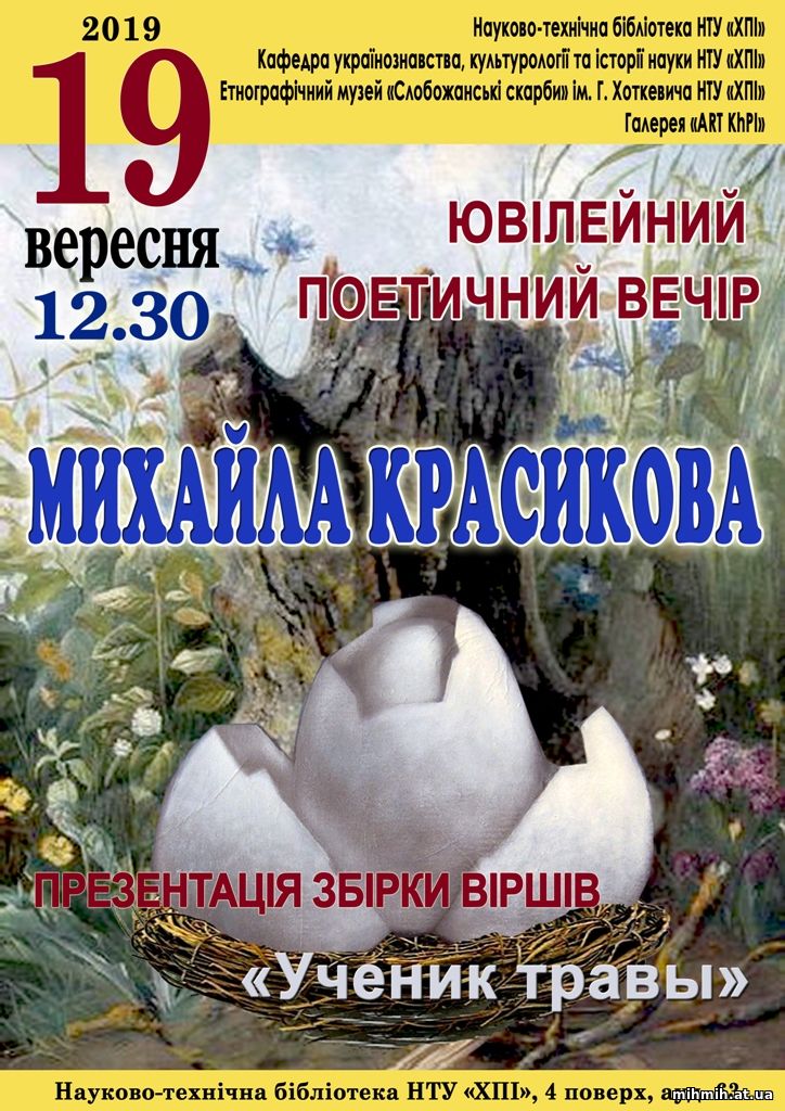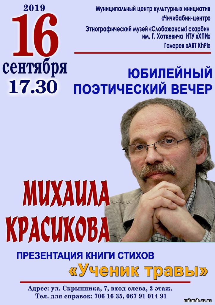 20 вересня о 17:00 у галереї «Мистецтво Слобожанщини» Харківського обласного організаційно-методичного центру культури і мистецтва відбудеться лекція з циклу «Eх libris Михайла Красикова про мистецтво», тема: «Любов як поезія, поезія як любов». Лектор - етнограф, фольклорист, культуролог, мистецтвознавець, літературознавець, поет Михайло Красиков. Дві найбільші загадки у світі — почуття любові і народження поезії — схожі. Більше того, людина, коли переймається любовʼю ... Читати далі » |